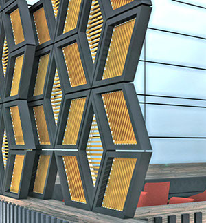 Die warmen Gelb-, Rot- und Brauntöne, die klaren und einladenden Strukturen des Innenraumdesigns und die unterschiedlichen Materialien sowie die blickdurch-lässigen, wabenförmigen Blenden sind unsere Interpretation orientalischer Gastfreundlichkeit.